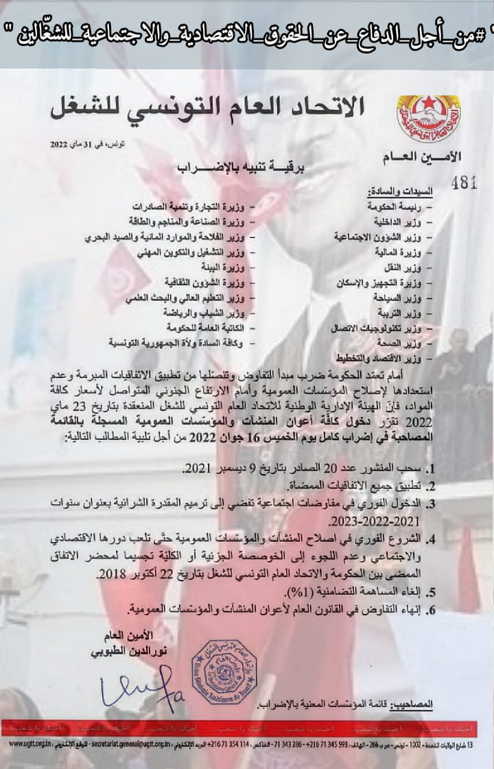أعلن الاتحاد العام التونسي للشغل عن دخول 159 منشأة ومؤسسة عمومية، في إضراب عام كامل يوم الخميس 16 جوان 2022 من أجل تلبية جملة المطالب.